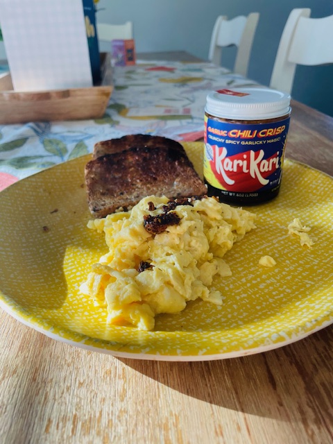 Recently, the food world was in uproar over a company’s trademark on chili crunch, otherwise known as chili crisp. This popular condiment adds a finishing touch over dumplings, noodles, eggs, and avocado toast. The crunchy, oily, spicy condiment is made of dried chili flakes, crispy fried garlic, or shallots, and sometimes sesame seeds. Some cookbooks and websites are dedicated to finding more ways to use the condiment, including as an ice cream topping. Self-proclaimed foodies have multiple jars of different chili crisps in their refrigerators. Terry and I discovered the joy of chili crisp, adding it to stir fries and spaghetti.