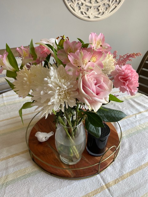 I can smell spring in the air, the faintest scent of dirt exhaling after its long winter slumber, while birds sing their morning songs. The air is still cool, but the sun and the wind whisper warm breezes, hugging my body. Even my music playlists are changing, from the mellow rhythms of yacht music to the upbeat melodies of Cole Poter and Frank Sinatra. To commemorate spring and offset my curmudgeon attitude due to daylight savings time, I bought myself some grocery store flowers. It started when a small bundle of daffodils smiled at me from their bucket. Then I saw another bouquet, full of light pink and white flowers that physically embodied the sounds of robins chirping. Initially, I was going to bundle both bouquets together. I later decided to spread the joy in four separate vases, creating expectant hopes of spring around my home.
